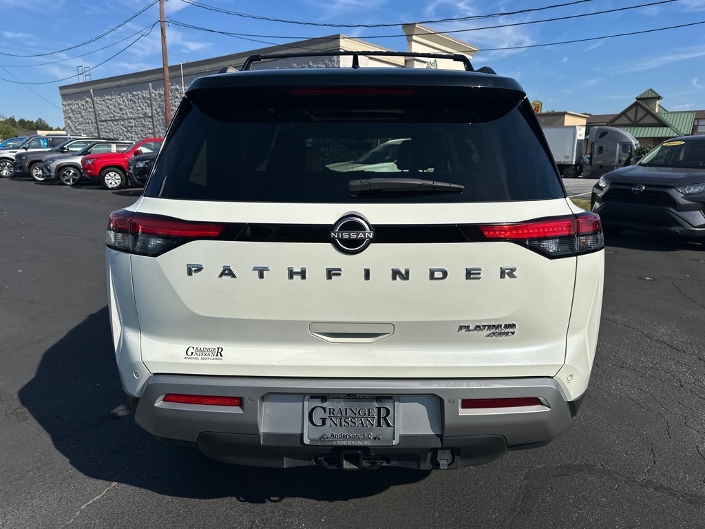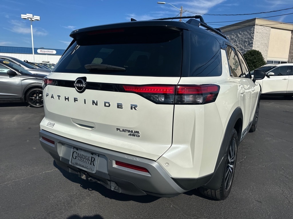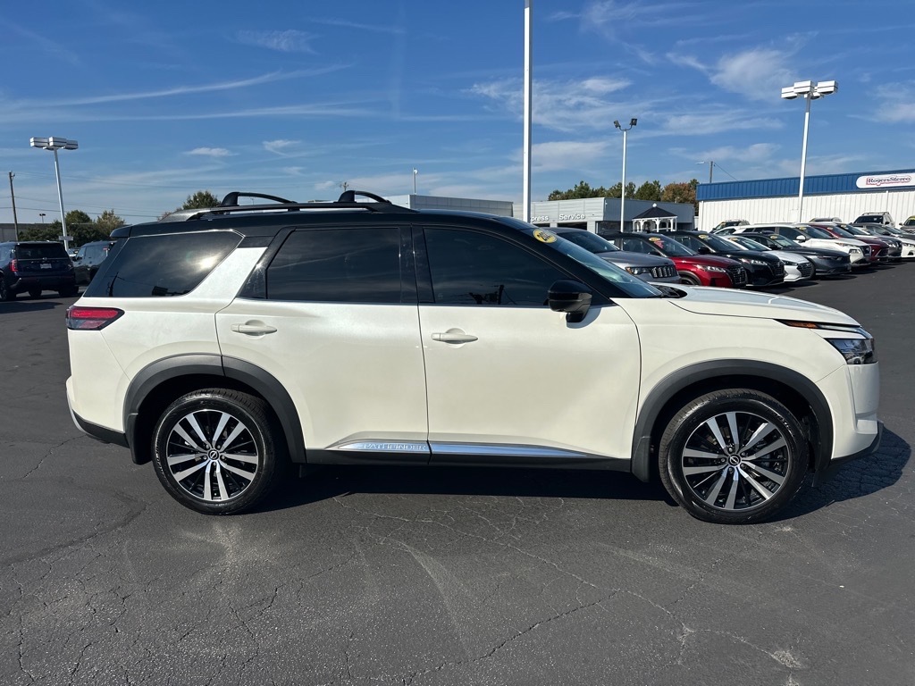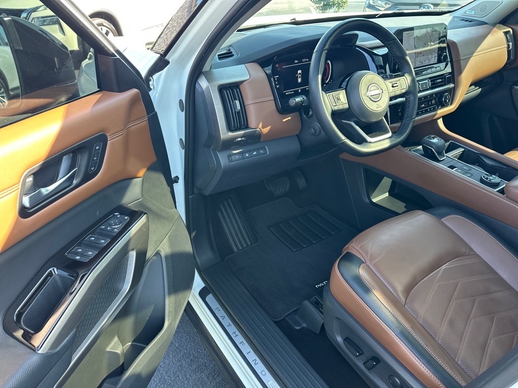 Heated Leather Seats, 3rd Row Seat, Navigation, Sunroof, Power Liftgate, 4x4, Captains Chairs, Panoramic Roof, Trailer Hitch READ MORE!KEY FEATURES INCLUDELeather Seats, Navigation, Sunroof, Panoramic Roof, 4x4, Power Liftgate, Rear Air, Heated Driver Seat, Heated Rear Seat, Cooled Driver Seat, Back-Up Camera, Premium Sound System, Satellite Radio, iPod/MP3 Input, Onboard Communications System. Rear Spoiler, MP3 Player, Keyless Entry, Privacy Glass, Remote Trunk Release. OPTION PACKAGESPLATINUM CAPTAIN CHAIRS PACKAGE 2nd-Row Captain Chairs, 2nd-Row Removable Center Console, CROSS BARS, LED FOG LAMPS. Nissan Platinum with Pearl White Tricoat/Super Black exterior and Chestnut interior features a V6 Cylinder Engine with 284 HP at 6400 RPM*. PRICED TO MOVEThis Pathfinder is priced $1,700 below J.D. Power Retail. All prices include $499 dealer documentation fee. Pricing analysis performed on 10/13/2025. Horsepower calculations based on trim engine configuration. Please confirm the accuracy of the included equipment by calling us prior to purchase.